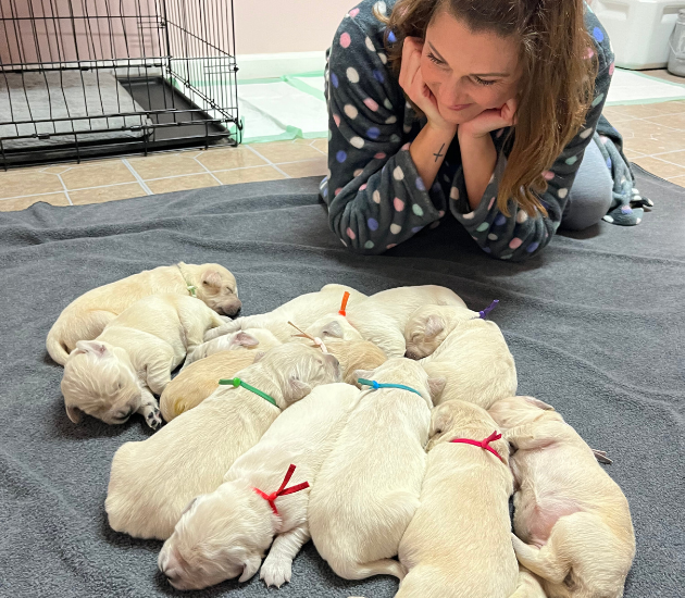 Golden retriever puppies born March 9th, 2024! If you’re interested in reserving your furry friend or would like more information, please click below.